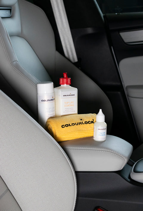 Leather should be treated with our COLOURLOCK Leather Shield to protect it against traces of wear and abrasion, as well as discolouration from clothing (dye transfer). The driver's seat (entry bolsters of sports seats and high support cushions) usually begin showing typical signs of wear over the first three years. Leather Shield will prevent this. For best results apply leather shield every 6 months.